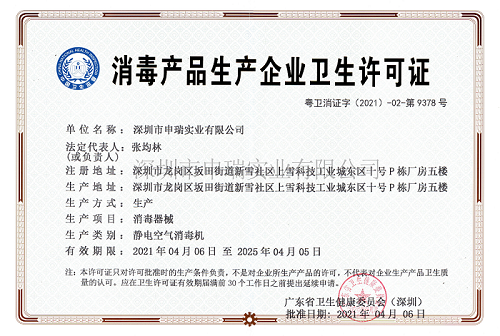 面對疫情防控的嚴峻形勢,申瑞積極響應政府號召和要求,高度關注疫情進展,全力支持抗擊疫情。在國家相關政策支持下,申瑞嚴格遵守消毒產品生產企業(yè)的法律要求申請辦理相關資質,并于近日獲批廣東省衛(wèi)生健康委員會頒發(fā)的《消毒產品生產企業(yè)衛(wèi)生許可證》,生產類別為靜電空氣消毒機。