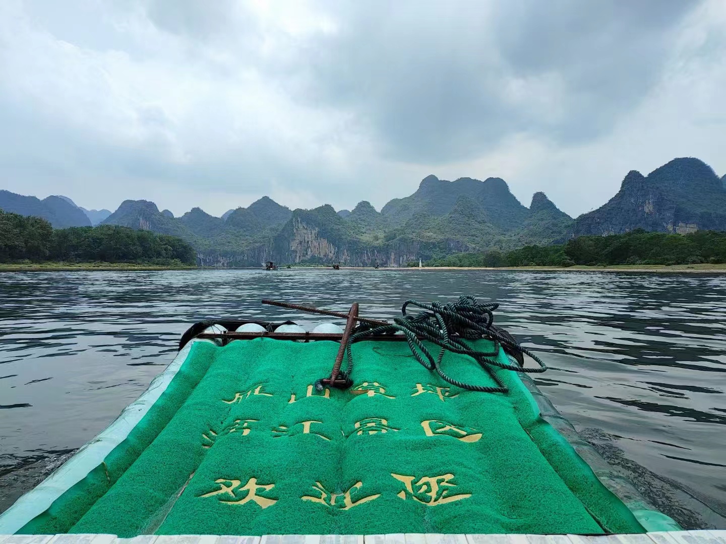 下午我們乘坐小竹筏,游覽漓江。兩岸山峰清秀迤邐,連綿起伏,形態(tài)萬千,江岸綠草如茵,翠竹蔥郁,樹木繁蔭。讓人仿佛進(jìn)入了天人合一的詩意境界,返璞歸真的自由天地。